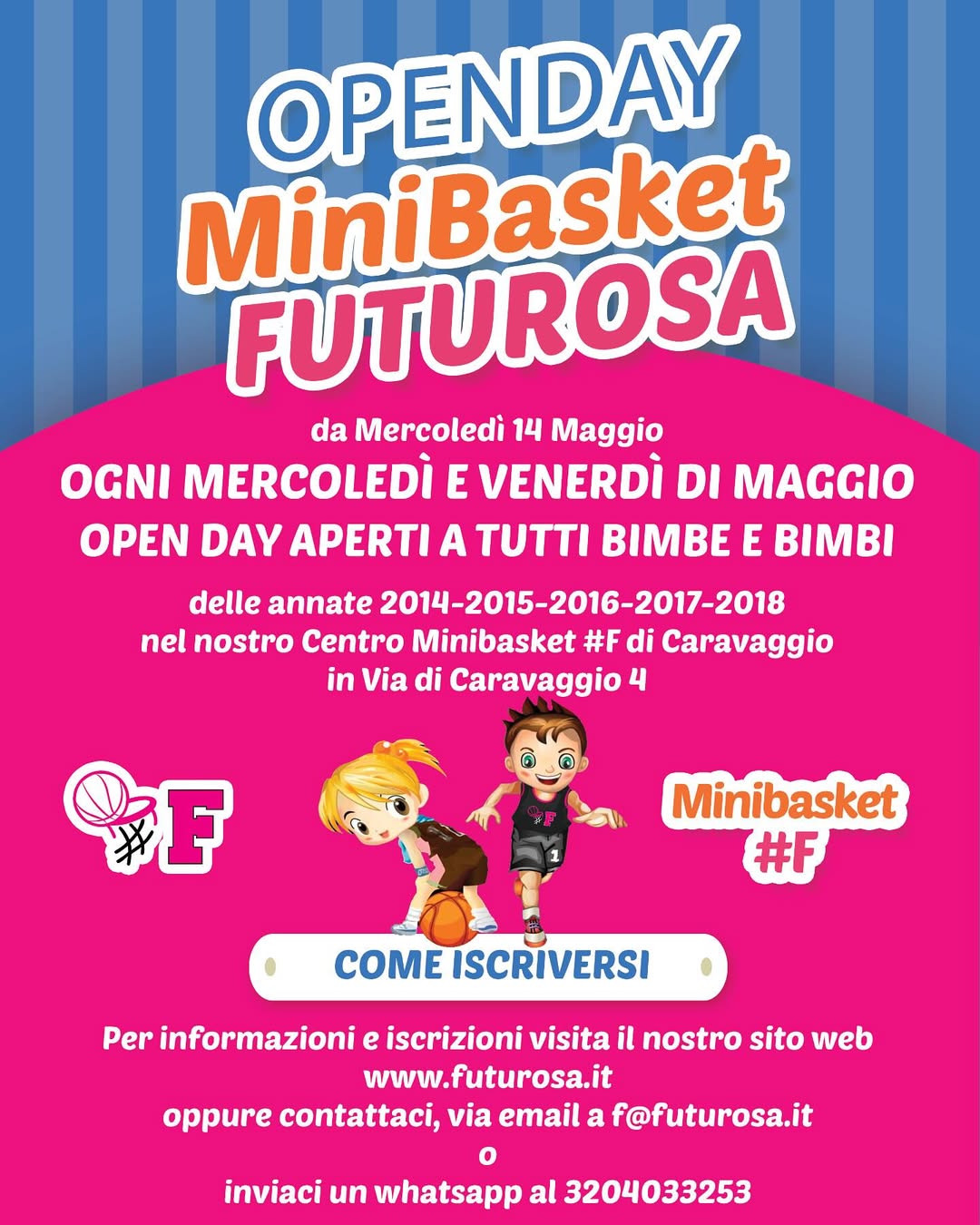 Per tutti mercoledรฌ e i venerdรฌ di Maggio allenamento aperti a tutti le bimbe e i bimbi delle annate 2014-2015-2016-2017-2018 Gli allenamenti si svolgeranno al